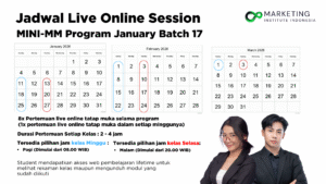 Program Mini-Master of Marketing Management (MM) dilaksanakan melalui zoom meeting selama 8 hari (periode 2 bulan) dengan pilihan Kelas Weekend Pagi (Jam 08.00 WIB – selesai) dan Kelas Weekday malam (Jam 20.00 WIB – selesai).